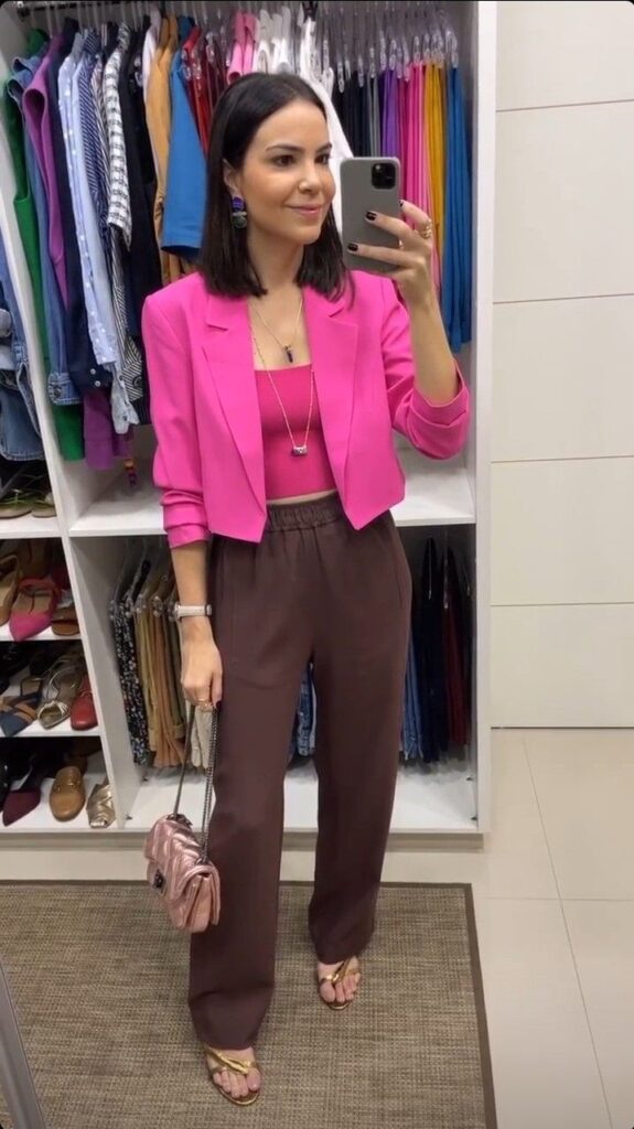 A combinação de marrom com rosa é, sem dúvida, uma das opções mais surpreendentes e sofisticadas. O marrom, por ser uma cor mais sóbria, muitas vezes é evitado, mas quando combinado com o rosa, ele ganha um toque feminino e moderno. O rosa quebra o peso do marrom, trazendo um frescor ao visual, sem ser exagerado. Essa combinação é ideal para quem quer criar um look equilibrado, com um toque de suavidade e modernidade. Ao contrário do que muitos pensam, o marrom não precisa ser uma cor sem vida – quando bem combinado, ele pode se tornar a base perfeita para um look vibrante e elegante.