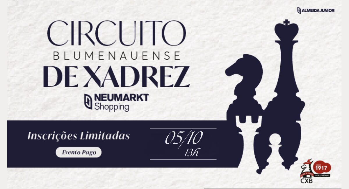 No próximo domingo, 05/10, às 13h, o Neumarkt Shopping recebe a 4ª Etapa do Circuito Blumenauense de Xadrez! Venha participar ou assistir a partidas emocionantes, cheias de estratégia, concentração e competitividade saudável.