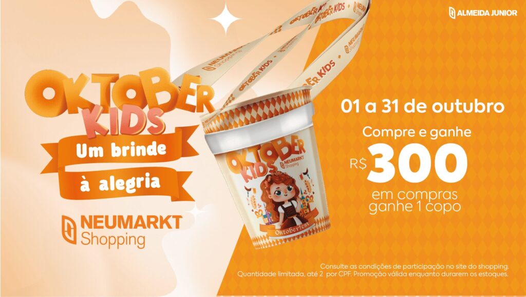 A distribuição será feita enquanto durarem os estoques. Não deixe de participar e garantir o seu! Para mais informações, consulte o regulamento completo da promoção: Shopping Neumarkt – Almeida Junior – Regulamento / Oktober Kids 2025